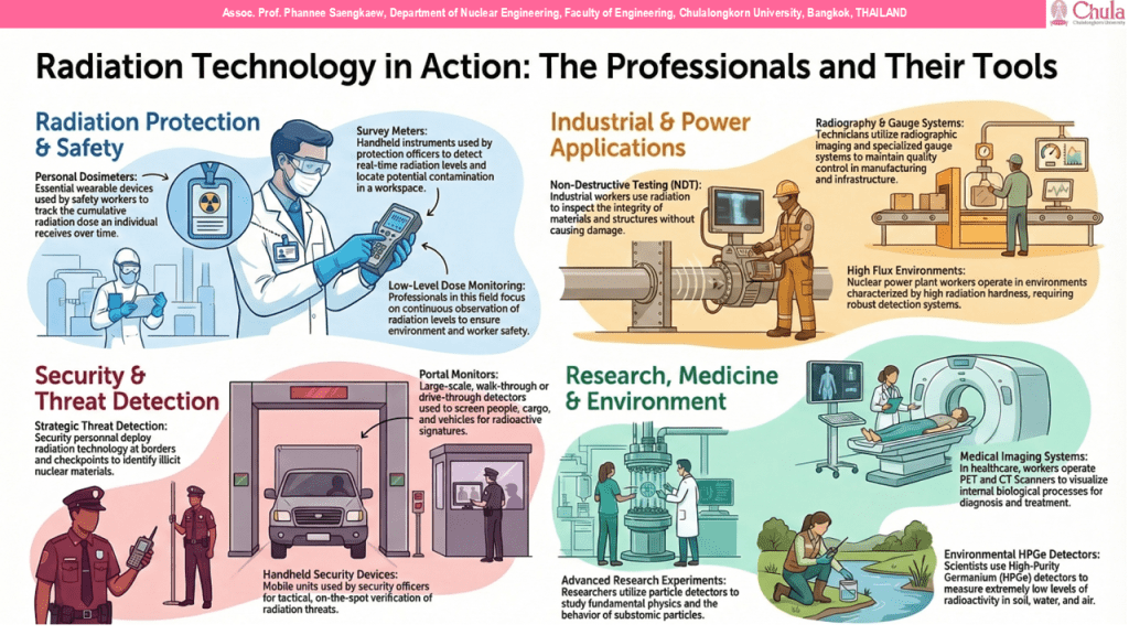 Nuclear and radiation technologies are uniquely characterized by their operation across an exceptionally wide range of physical conditions, spanning more than 15 orders of magnitude in radiation intensity. From trace environmental radioactivity to the extreme neutron flux within reactor cores, these applications rely fundamentally on the interaction of ionizing radiation with matter. Accordingly, the ability to detect and quantify radiation is not merely supportive but constitutes a central enabling function across all domains.