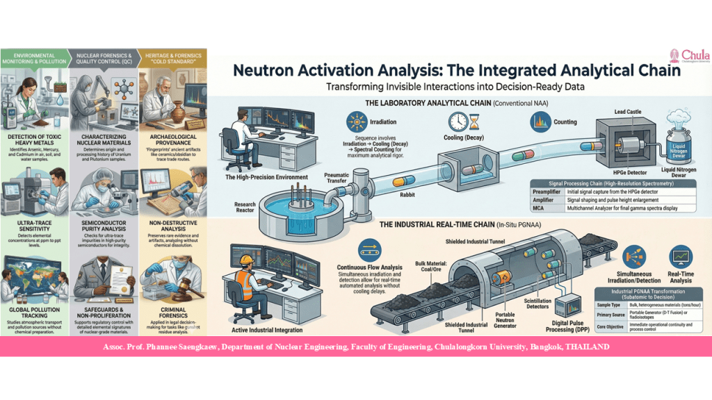 ดังนั้น เทคนิค NAA จึงไม่ควรถูกมองเพียงเป็นเทคนิควิเคราะห์องค์ประกอบธาตุชนิดหนึ่งเท่านั้น แต่ควรถูกมองว่าเป็น แพลตฟอร์มการวิเคราะห์เชิงนิวเคลียร์แบบบูรณาการ ที่เชื่อมโยงฟิสิกส์นิวเคลียร์ การตรวจวัดรังสี และวิทยาการข้อมูลเข้าด้วยกัน เพื่อสร้างข้อมูลเชิงวิเคราะห์ระดับสูงสำหรับการตัดสินใจในระบบวิทยาศาสตร์และอุตสาหกรรมสมัยใหม่