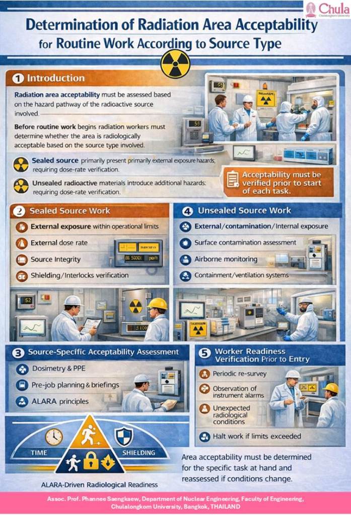 ดังนั้น การพิจารณาความพร้อมของพื้นที่และความพร้อมของผู้ปฏิบัติงานจึงต้องปรับให้เหมาะสมกับลักษณะของอันตรายนั้น โดยอาศัยหลักการประเมินเชิงรังสี การควบคุมทางวิศวกรรม มาตรการทางบริหาร และแนวคิด ALARA อย่างบูรณาการ เพื่อให้การปฏิบัติงานทางรังสีสามารถดำเนินได้อย่างปลอดภัย มีประสิทธิภาพ และอยู่ภายใต้การควบคุมที่เหมาะสม