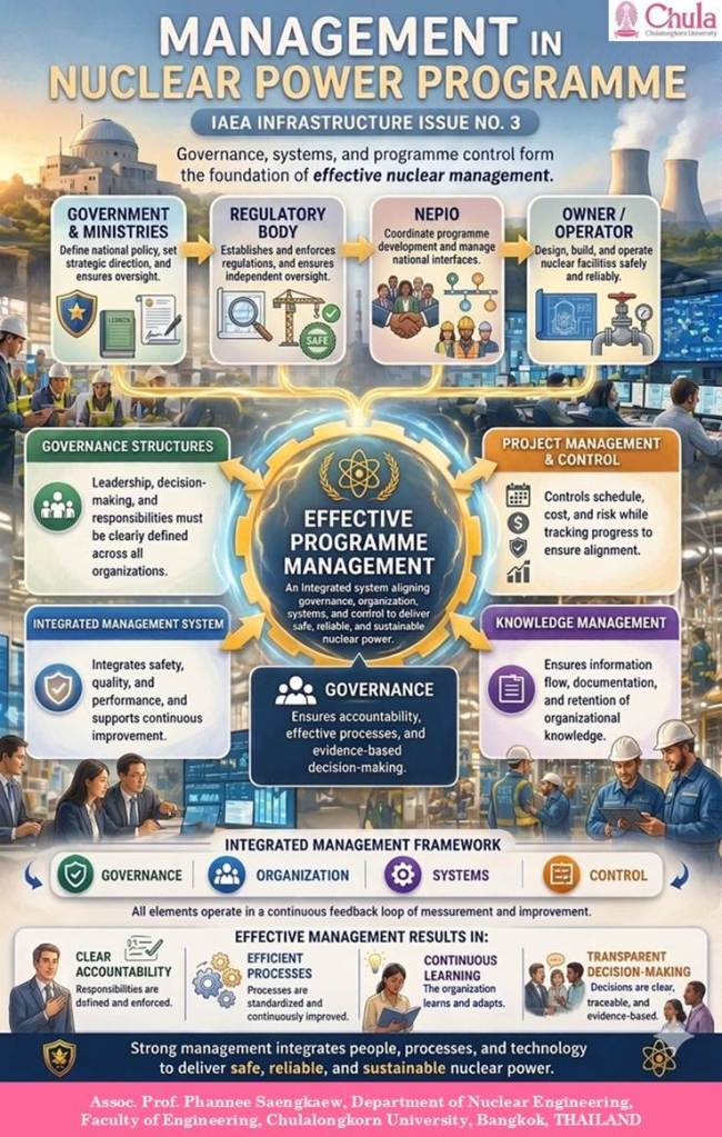 การบริหารจัดการเป็นองค์ประกอบหลักที่ทำให้โครงการพลังงานนิวเคลียร์สามารถดำเนินไปได้อย่างปลอดภัย มีประสิทธิภาพ และยั่งยืน โดยสร้างความรับผิดชอบที่ชัดเจน กระบวนการที่มีประสิทธิผล การเรียนรู้อย่างต่อเนื่อง และการตัดสินใจที่โปร่งใส